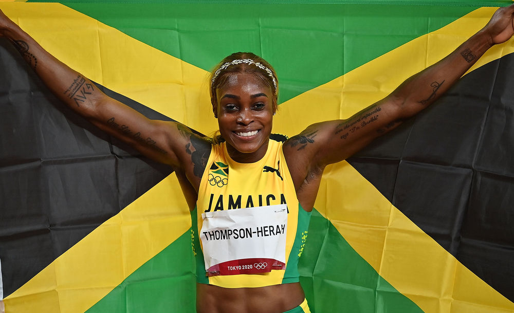 这是2021年7月31日,牙买加选手伊莱恩·汤普森夺得东京奥运会田径比赛女子100米冠军后庆祝。新华社记者 贾宇辰 摄