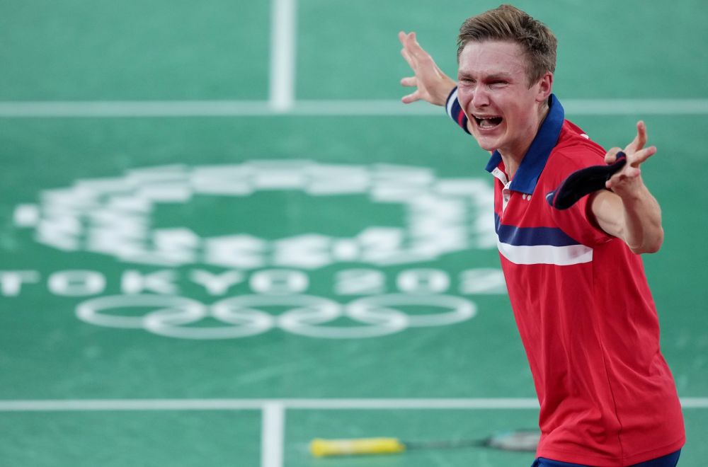 这是2021年8月2日,丹麦选手安赛龙在东京奥运会羽毛球男子单打决赛后庆祝夺冠。新华社记者 薛玉斌 摄