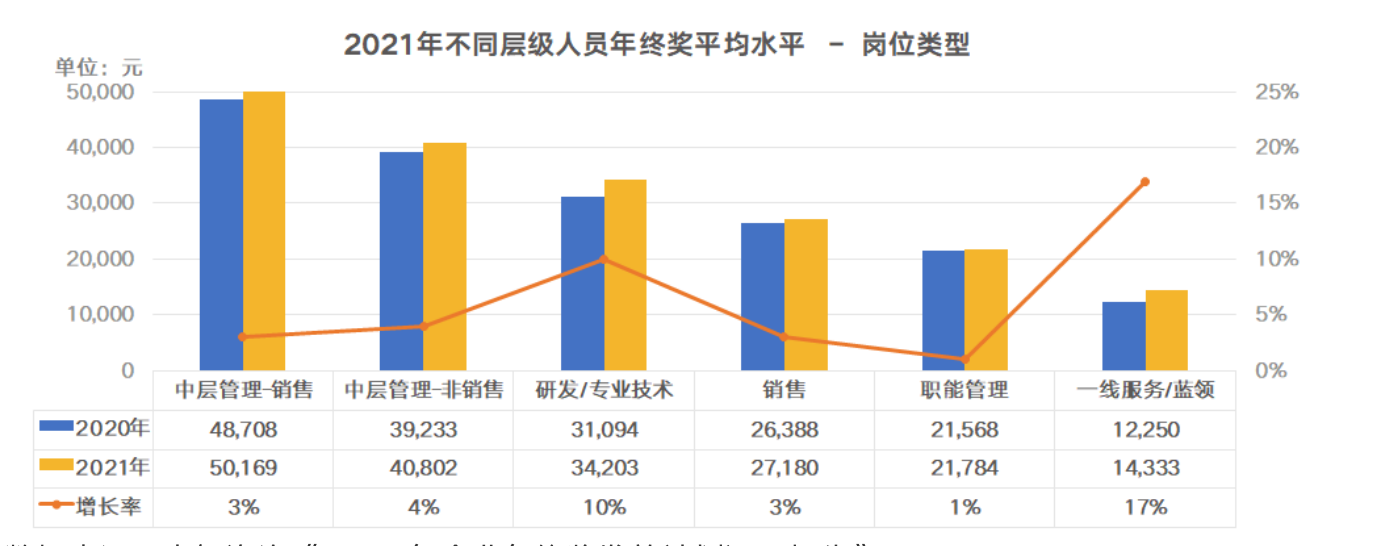 数据表明,2021年中层管理-销售人员的年终奖平均值最高(5.02万元),其次为中层管理-非销售人员(4.08万元)。研发/专业技术人员年终奖平均为3.4万元,相比去年增长10%。反映了在该类人才需求旺盛、人才流动活跃的情况下,企业加强对于研发和专业技术人才激励保留力度的现状。