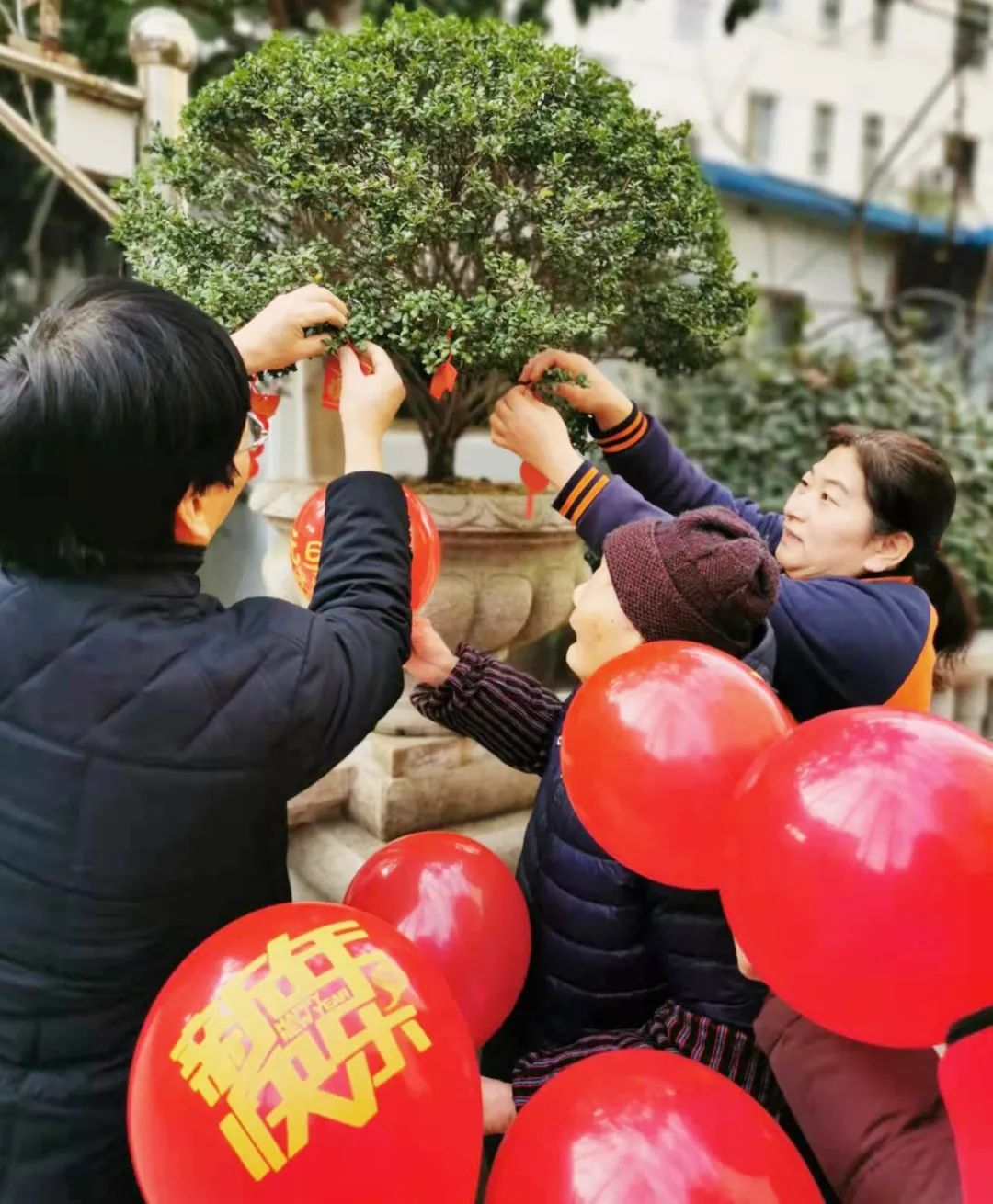 1月1日一早,天山社区颐养长者照护之家的老人们就换上新衣,一起在许愿树下吹气球,并将自己的愿望气球系在树上。
