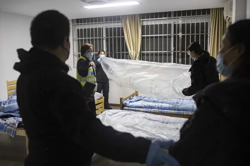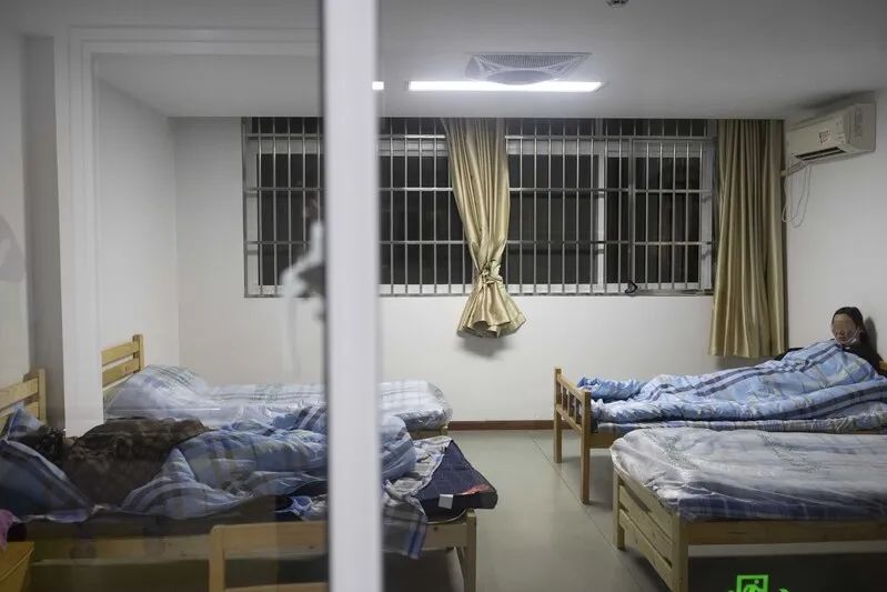 特保人员为一名救助对象铺床被,赵雪娟让她放轻松,早点上床休息。
