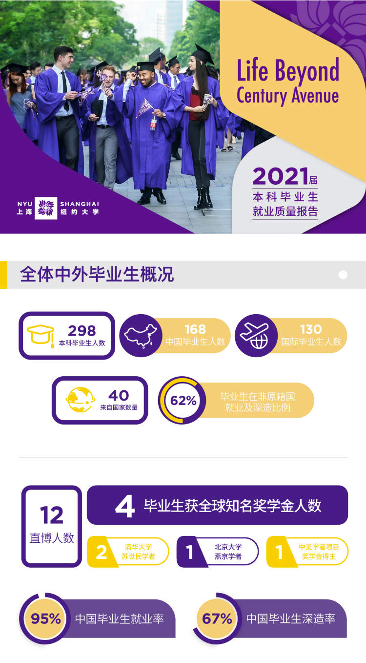 校方表示,在2021年全球就业形势持续严峻的大环境下,上海纽约大学2021届毕业生在探索人生新旅程的道路上开创佳绩。
