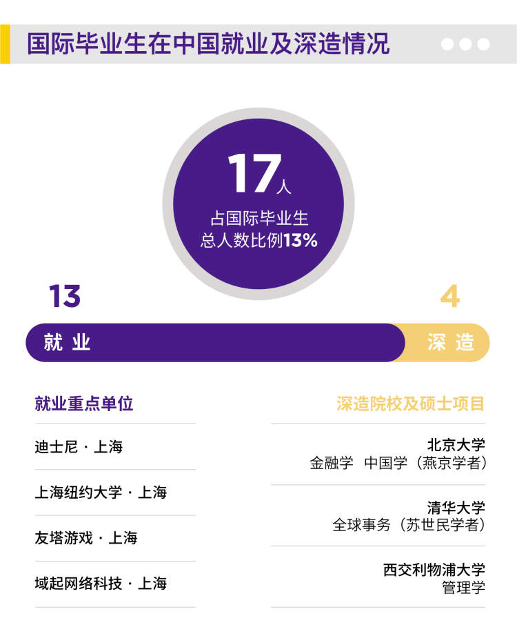 共有4名中外毕业生入选清华大学苏世民学者、北京大学燕京学者、中美学者项目等全球知名奖学金项目。今年因受疫情影响,一些国际毕业生无法回到中国参加毕业典礼。但仍有17名国际毕业生在中国深造和就业,占国际毕业生总人数13%,较去年大幅增长。其中13人的就业人数为历年最高。