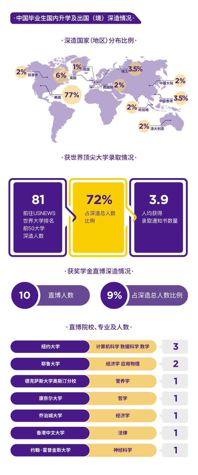 10人获得奖学金直博,占深造总人数9%。人均获得3.9份录取通知书。
