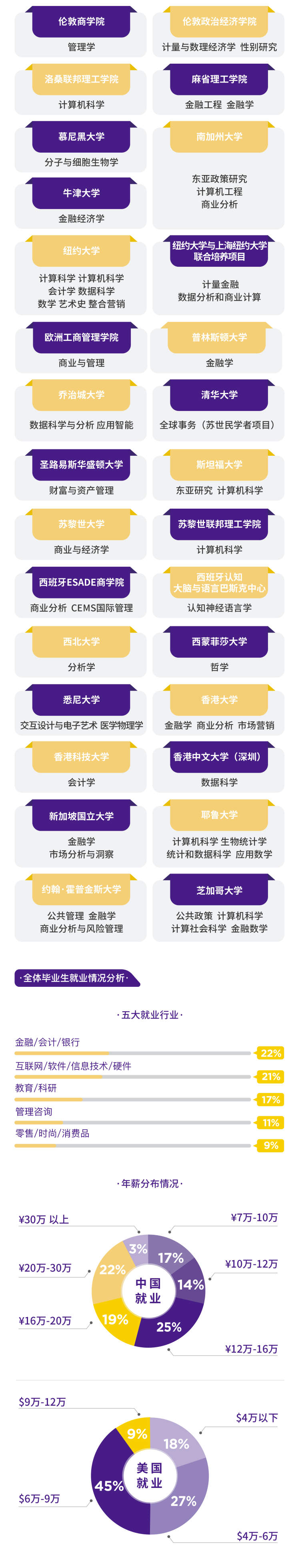 67%选择继续深造,其中,81人前往U.S. News世界大学排名前50大学深造,占中国毕业生深造总人数的72%。