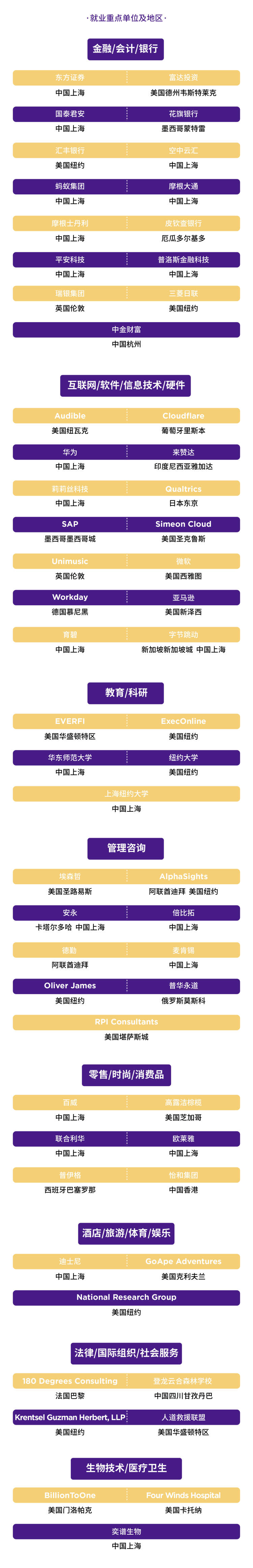 迈进职场的中国毕业生一如既往地受到各大名企青睐,就业领域主要覆盖金融/会计/银行、互联网/软件/信息技术/硬件、教育/科研、管理咨询、零售/时尚/消费品等,更有毕业生践行公益理想,前往偏远山区投身创新教育。