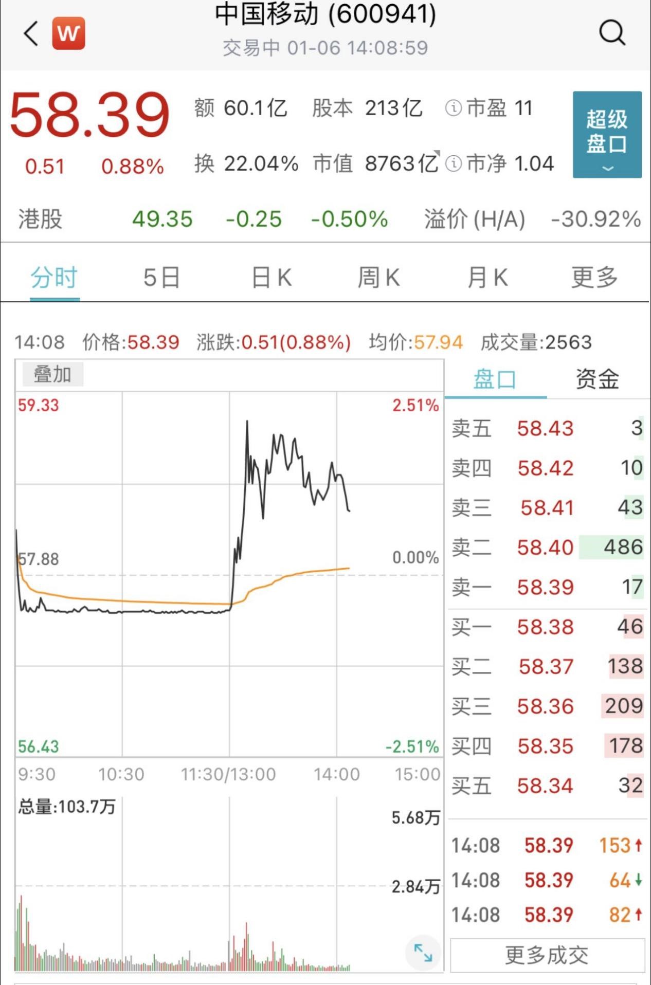 1月5日上市首日,中国移动A股成功守住发行价。中国移动A股股价当日高开低走,虽然开盘报63元/股,盘中一度上涨超过8%,但随后持续下行。截至当日收盘,中国移动收报57.88元/股,涨0.52%。