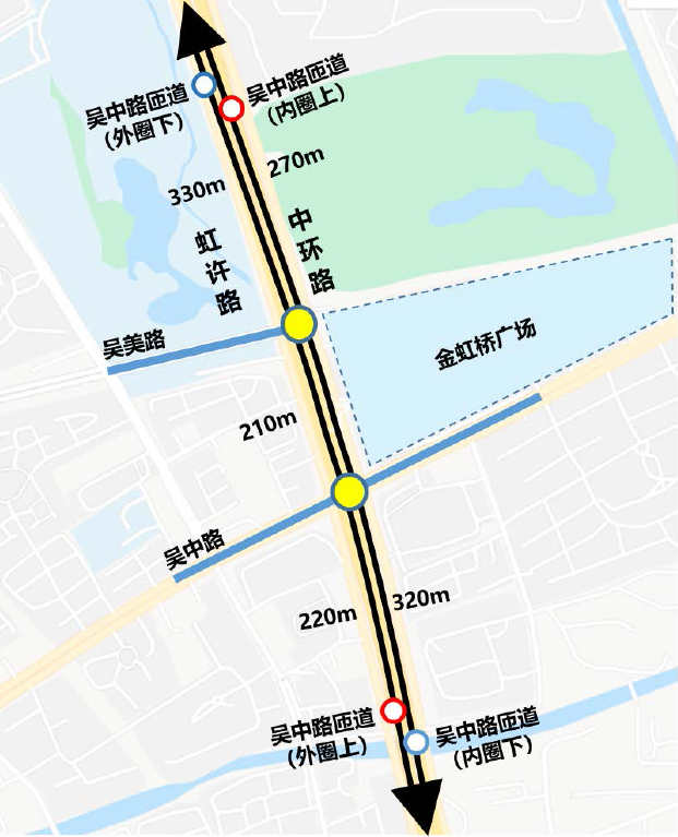 该路段通车后,上海市公安局闵行分局交警支队调研发现吴美路口早晚高峰车流量较高,自中环吴中路(外圈)下匝道的车辆经常性溢出,影响中环主线车辆通行