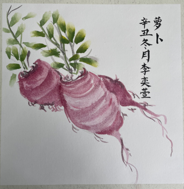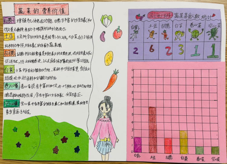 有的学生变身为“双语小记者”,结合书本相关知识,用英语和中文采访农场农作的劳动者的故事;有的学生像“数学家”,走进农场,带着测量工具测算农田面积,计算篱笆长度;有的学生像“设计师”一般设计图纸,在保障各班农田面积均分的情况下,优化田地布局;有的小朋友变身为“小厨师”,为即将到来的学校美食节设计了精美的英文菜单;有的学生如同“小画家”,将形态各异的蔬菜进行重新构图与组合创作,绘制彩墨蔬菜作品。
