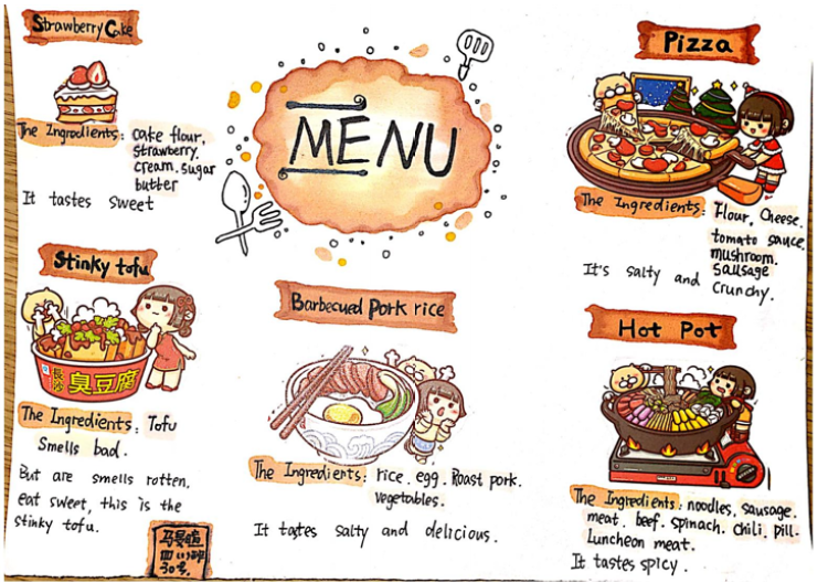 “我设计了英文菜单,上面画了草莓蛋糕、臭豆腐、披萨……中式和西式食物都有!老师都夸我画得好看呢。”四1班的马旻暄透露。