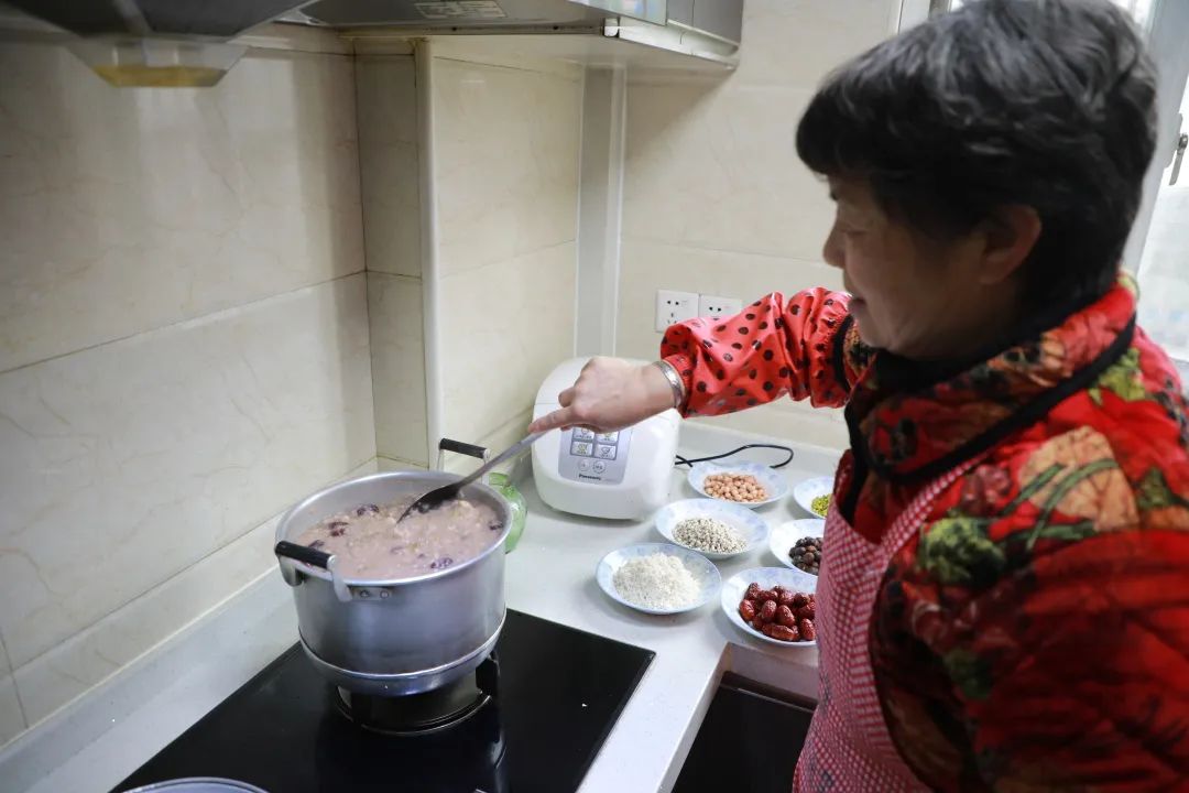 一大早,嘉定镇街道西大社区香樟苑小区居民彭月琴就忙活开了。她将提前准备好的薏米、红枣、莲子、花生等食材清洗干净,放入锅中文火慢熬。两个小时后,一锅热气腾腾的腊八粥出炉。