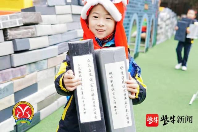 所谓“砌城墙”,就是该小学二年级的小朋友每人带两块“城墙砖”,并用这些自制砖砌成一面高1.2米、长9米的城墙。不难看出,这场期末测评是一场集体“研学活动”。孩子们亲手制作“城墙砖”和“砌城墙”的过程,不仅锻炼了他们的实际动手能力,也检验了他们的独立思考能力。在测评活动中,老师们还设计了很多闯关游戏。比如语文组要读一些学过的词语,数学组设计了立体图形的拼搭,完成以后可获得“登城密码”,闯关成功的同学可以盖上“虎虎生威”章。同时,还考察了礼让排队、文明就餐等。
