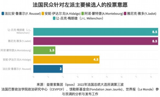 尽管党派和候选人数量众多,但根据最近数次民调显示,在当前情况下其中无一人能够进入大选第二轮。根据法国目前发行量第一的全国性报纸《世界报》与巴黎政治学院合作制作、于去年12月18日发布的一份民调显示,即使是这些候选人中的佼佼者,雅多和梅郎雄,民众的投票意愿也都只是维持在8.5%左右,不仅与现任马克龙24%的投票意愿相差甚远,即使是相较于极右的勒庞和泽穆尔的15%左右来说,都可以体现出左派候选人对法国选民的吸引力有限。