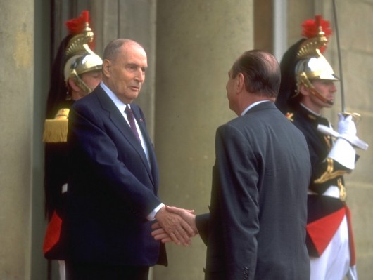 1995年5月17日,法国巴黎,新任总统希拉克(右)与前任总统密特朗(左)进行职权交接仪式。