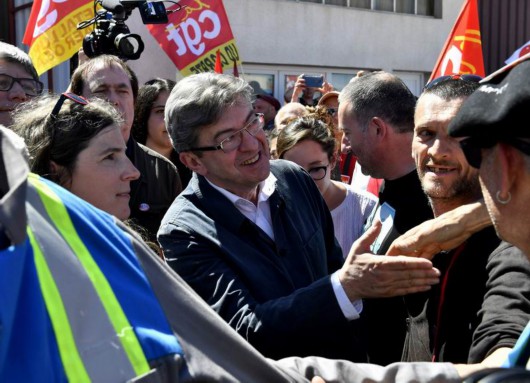 2017年5月16日,法国拉苏泰尔兰,GM&S汽车配件供应商的员工在公司面临破产时,举行游行要求拯救公司,前法国极左翼总统候选人梅朗雄到现场与员工进行交流。