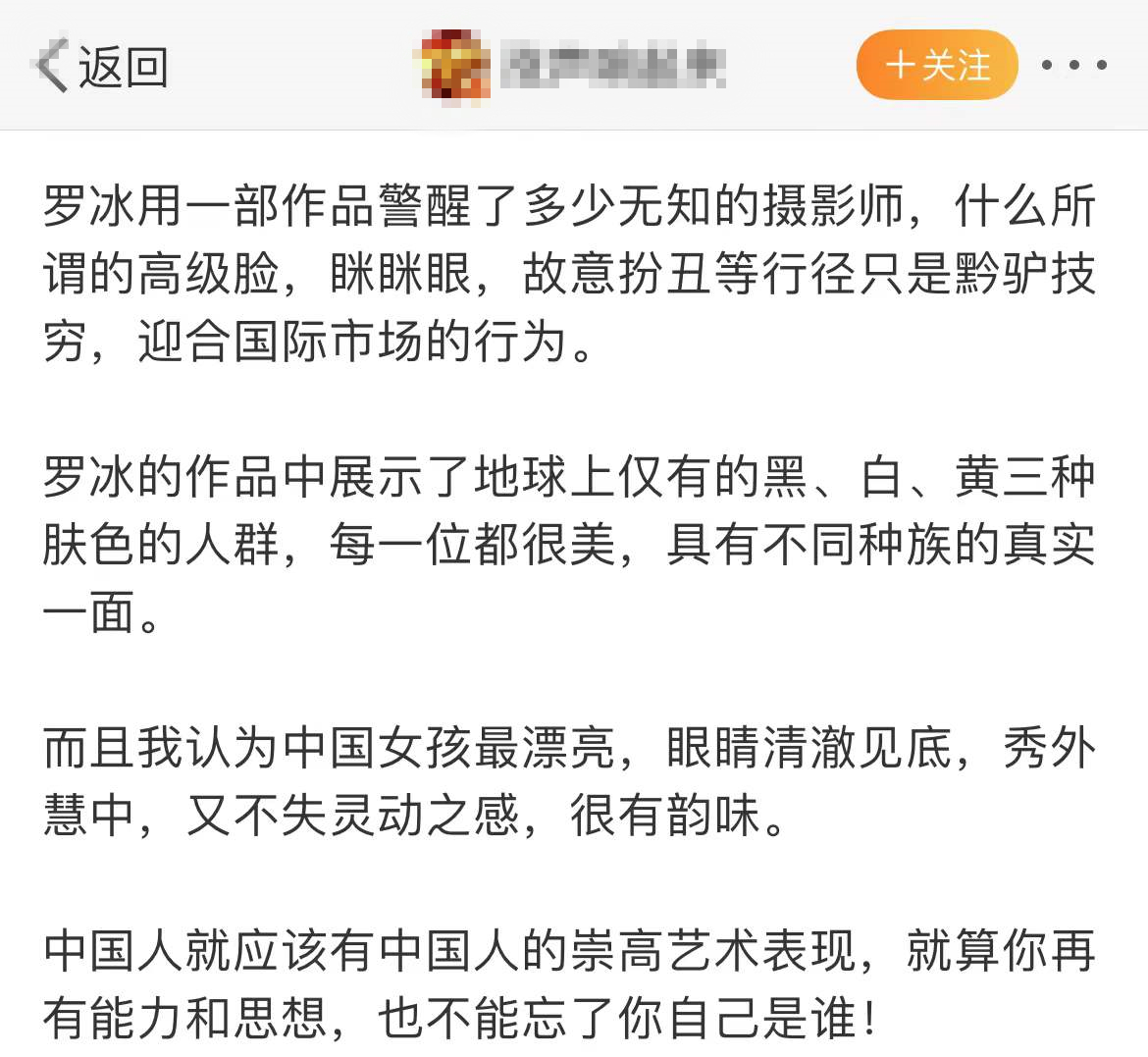 罗冰近日也在社交媒体上发文表示,拍这组照片的初衷是想表达各种肤色的女性都是美的代表,但作为一名中国摄影师也有希望向全世界展示更多东方之美的私心。