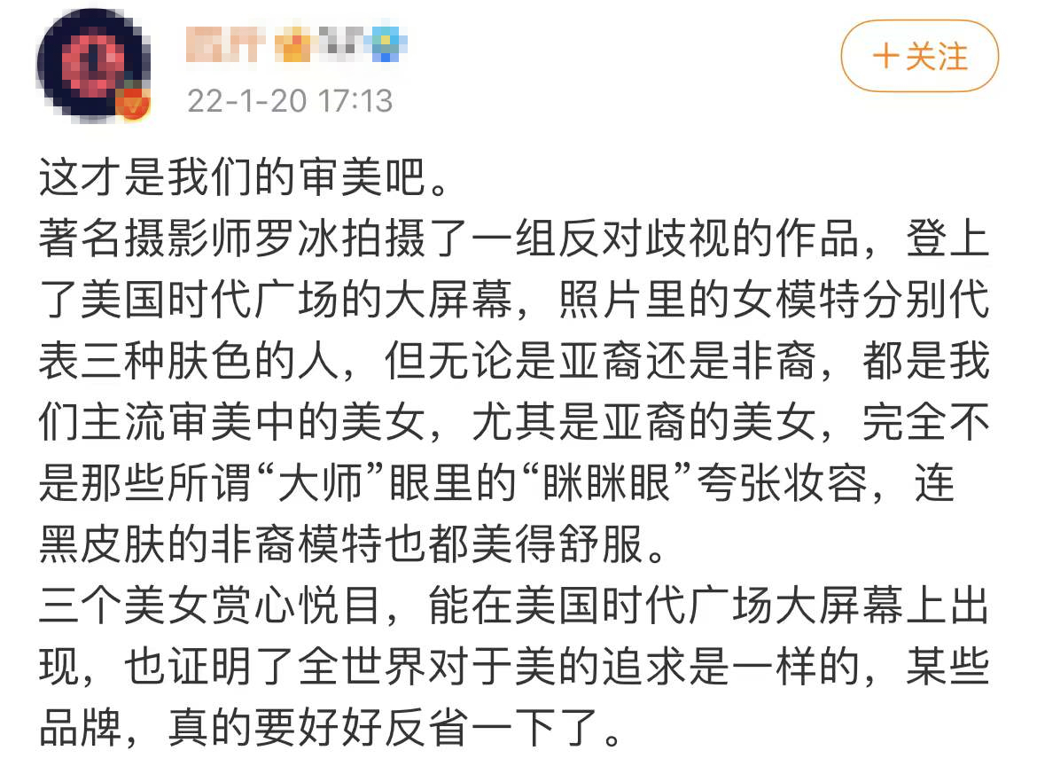 最近,中国摄影师罗冰拍摄的反歧视作品登上美国纽约时代广场大屏,代表不同人种的三位女性模特互相依偎,展现不同肤色的女性之美。其中代表黄种人的女模特,化着清丽温婉的东方妆容,没有出现“眯眯眼”“塌鼻梁”等西方关于亚洲人的刻板印象,获得众多中国网友关注和点赞。
