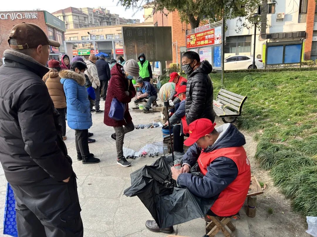杨行镇便民服务队的磨刀志愿者边与居民聊天,边为刀具打磨,不出几分钟,一把又锈又钝的菜刀转眼变身成了锋利的好刀。