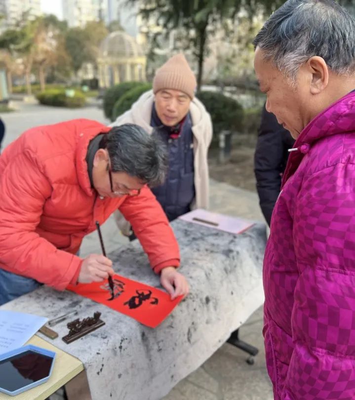 大家都忙得不亦乐乎,洋溢着欢乐和谐的“年”味。拿到春联的居民个个喜笑颜开,开心不已。大家对现场创作春联的评价就是:墨香、字靓、年味足。