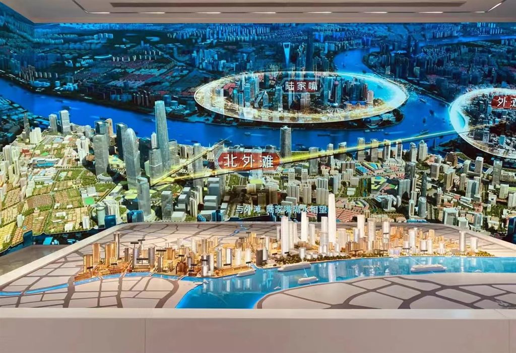一楼布置的1:750模型,集中展示了北外滩一江一河一港、一心两片的城市格局。