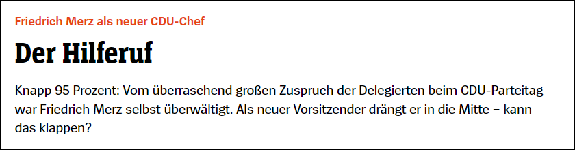 德国《明镜周刊》称,在执政16年后,基民盟失去了所有,党派总理候选人拉舍特也丢失了总理和主席职位。是基民盟内部的“集体呼救声”将默茨推上了主席之位。