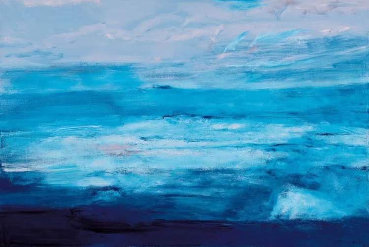 画面上,蓝色基调的色彩柔美而梦幻,从下方的深海蓝色向上,色彩逐层变化:深沉的海蓝、璀璨的宝蓝、澎湃的蔚蓝、宁静的湛蓝以及轻柔的天蓝,搭建出海天一色的结构。让此幅作品充满了无穷的节奏感,以及自然流动的轻灵感,宛如海风吹拂于尘世。