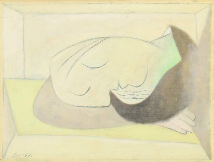 画中主角玛丽·特雷斯的头枕在手上,一条简洁的弧线刻画出她闭上的眼睛,她的头部宛如一弯新月,熠熠生辉,光华璀璨,毕加索在画中出其不意地捕捉到了爱人的无瑕纯净,整个场景宛在梦中。