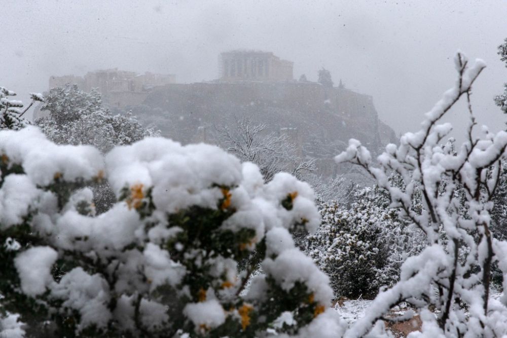 这是1月24日拍摄的雪中的希腊雅典卫城。(新华社发,马里奥斯·罗洛斯摄)