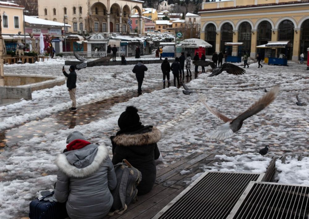 这是1月25日拍摄的雪后的希腊雅典市中心广场。(新华社发,马里奥斯·罗洛斯摄)
