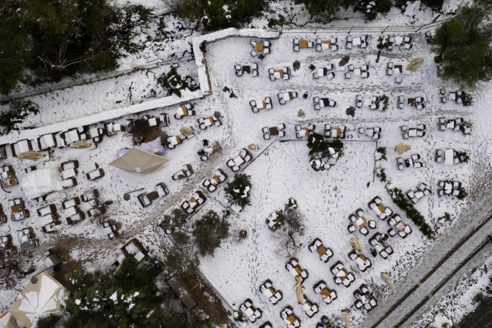 这是1月25日拍摄的雪后的希腊雅典市中心一处露天咖啡厅(无人机照片)。(新华社发,莱夫特里斯·帕察里斯摄)