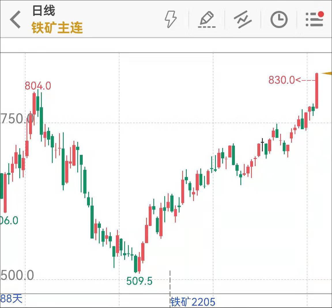 大商所铁矿期货主力(5月)合约上涨7.59%,报829元/吨,刷新去年10月以来的高点。去年11月中旬,铁矿石期货在长达近5个月的下跌后探底,最低报价接近500元/吨,随后,价格一路回升,尤其是今年以来走出一波快速上涨。