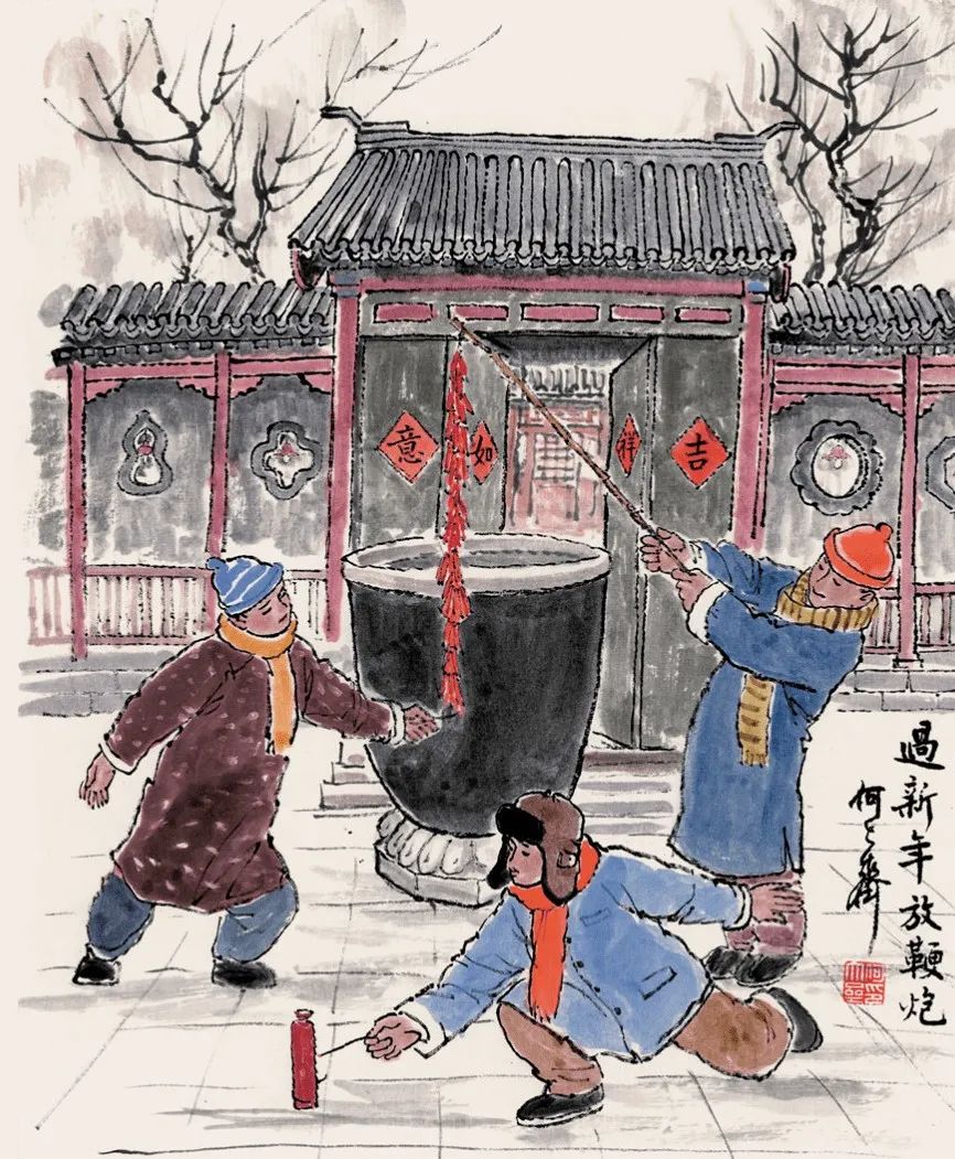 自小生于斯、长于斯的何大齐,对北京有着虔诚般的喜爱。他走惯了九曲连环的大小胡同,喝惯了馨香爽口的豆汁儿,听惯了京腔京韵自多情的京韵大鼓,也看惯了踩着高跷、玩着杂耍的一场场庙会。那些火热的生活场景,如过电影般,一年年在脑海里翻腾回旋,特别是春节期间,诸多热火朝天的“闹”年镜像,又会推陈出新地一次次在原乡上演。于是,那些文化的濡染和浸润,便促使他毅然拿起画笔,摊开稿纸,绘制北京的人文风情,叙述京城的年俗故事。