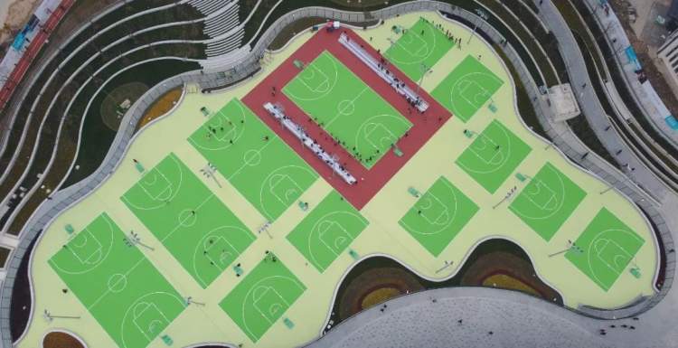 建筑设计共两层,“万体汇”两层设施均设在地下,同时配套下沉式篮球公园,解决地下室采光、通风等问题,馆体屋顶绿化与整个公园绿化体系融合串联,地下一层设置为层高较高的球类运动空间,地下二层为普通层高,预留大空间满足未来不同运动项目需求和轻餐饮配套设施。
