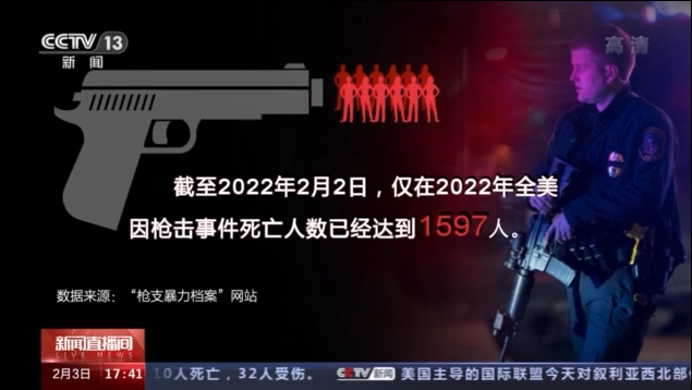 美国“枪支暴力档案”网站公布的最新数据显示,截至2022年2月2日,仅在2022年全美因枪击事件死亡人数已经达到1597人。