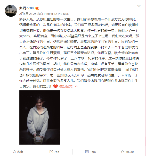 2月6日,黄磊老婆孙莉在个人社交平台上发文为大女儿多多庆祝16岁生日,她回忆起给女儿过的最难忘、最热闹的生日,并透露多多今年选择和同学一起过生日,“这一次你的生日你决定和几个要好的同学一起过,我们只负责接送,点餐,还有买单。”孙莉感慨“我们也开始慢慢的学会,用一些新的方式去和你一起共同度过你的生日”,并深情告白女儿:“未来的日子你会越走越远,可是亲爱的多多人儿,我们都会永远用心陪伴你并永远爱你!生日快乐,我们的宝贝!”