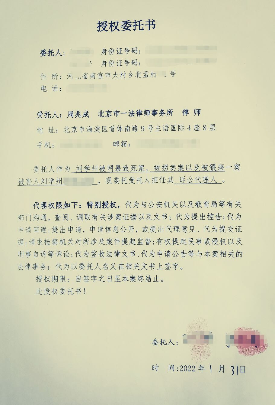 大象新闻记者2月8日获悉,刘学州养家亲属于近日委托北京市一法律师事务所律师周兆成维权。授权委托书显示:刘学州被网暴致死案、被拐卖案以及被猥亵案,特别授权周兆成有权提起民事或侵权以及刑事自诉等诉讼。