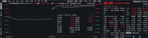 受业绩远超预期影响,泰森食品(TYSON)盘中触及99.53美元的历史新高,股价创下两年来最大涨幅,收涨12.23%,报收99.09美元。