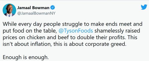 当地时间2月8日,民主党人、美国众议员Jamaal Bowman指责泰森食品“无耻地抬高价格以增厚其利润”,而人们每天勉强才能维持生计。