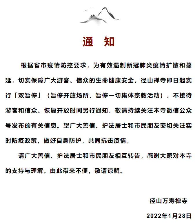 而径山寺的官方公众号早在1月28日便发布了实行「双暂停」措施的通知。通知称,自1月28日起暂停开放场所、暂停一切集体宗教活动,不接待游客和信众,恢复开放时间另行通知。且此后径山寺方面并未发布重新开放的消息。