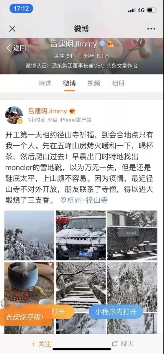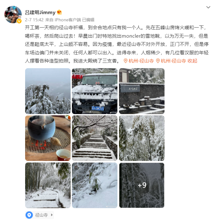 目前,吕建明个人微博账号“Jimmylui吕建明”显示,其在2月7日发布了一则径山祈福活动的相关消息:“开工第一天相约径山寺祈福,到会活地点只有我一个人......因为疫情,最近径山寺不对外开放,正门不开,但是停车场边偏门并未关闭,任何人都可以出入。进得寺来......我进大殿烧了三支香。”