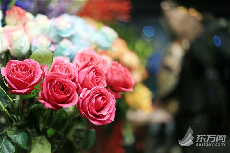 在虹桥花卉市场,由于是工作日关系,客人并不多,花商们忙着修剪早晨到货的鲜切花,每个摊位都把玫瑰摆在了最显眼的位置。红玫瑰、白玫瑰、蓝玫瑰,乱花渐欲迷人眼。“花市周末人多,很多年轻人会来买花。”一位女花商告诉记者。