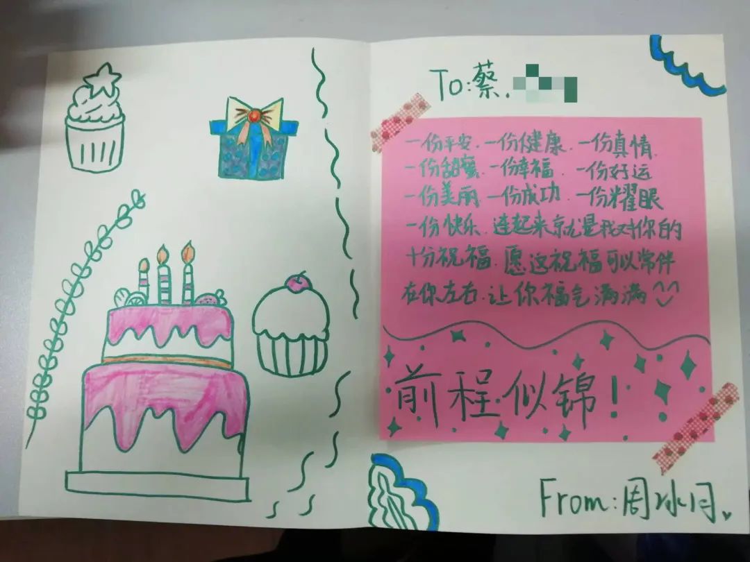 周冰月同学还送了一张卡片给蔡同学:“一份平安、一份健康、一份真情、一份甜蜜、一份幸福……连起来就是我对你的十分祝福!愿这祝福可以常伴在你左右,让你福气满满!前程似锦!”