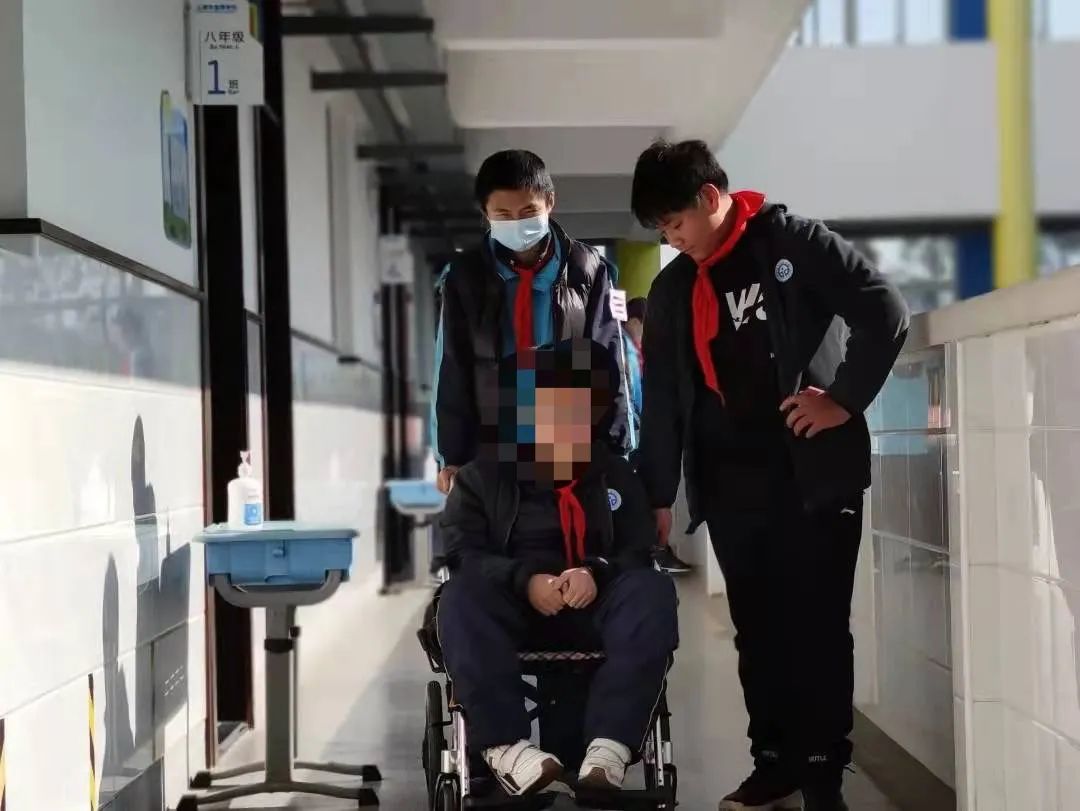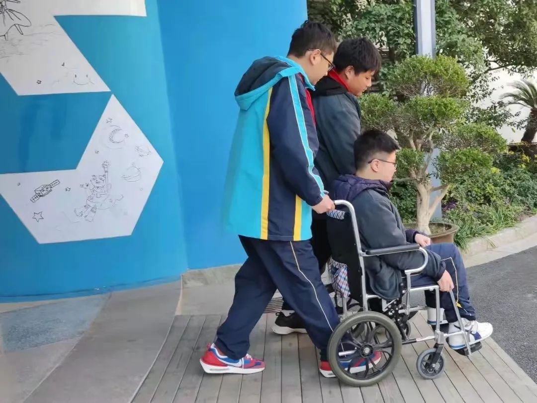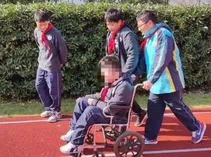 就算是体育课,蔡同学不曾一人孤单地在教室里。同学们总是主动地把他推到操场上,有时也推着轮椅,带他感受奔跑的感觉。蔡同学说:“跟伙伴们在一起的每一天,都特别快乐!”