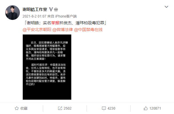 据悉,去年8月2日凌晨,谢明皓工作室发文,称要实名举报林俊杰、潘玮柏涉毒,并艾特有关部门,希望对两人进行验毒,还称对自己的举报愿意负法律责任。