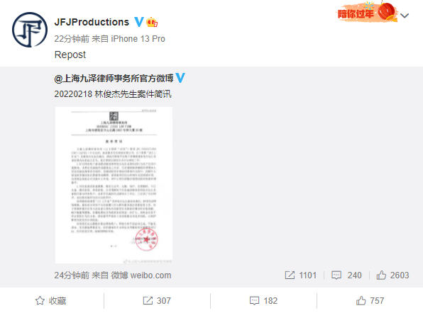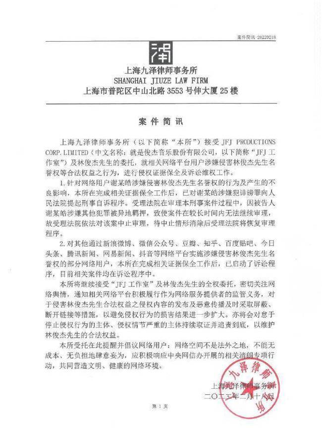 2月18日,林俊杰方委托律师发布案件简讯,表示就相关网络平台用户涉嫌侵害林俊杰名誉权等合法权益的行为,进行侵权证据保全及诉讼维权工作。