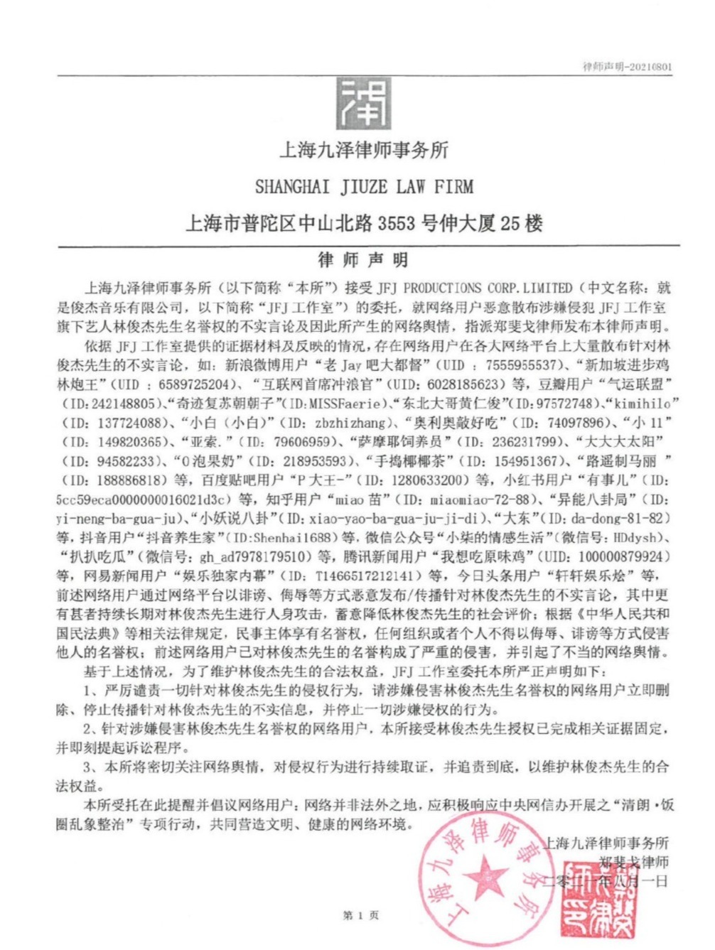 林俊杰方正式起诉谢某皓侵犯名誉权 相关案件正在审理中