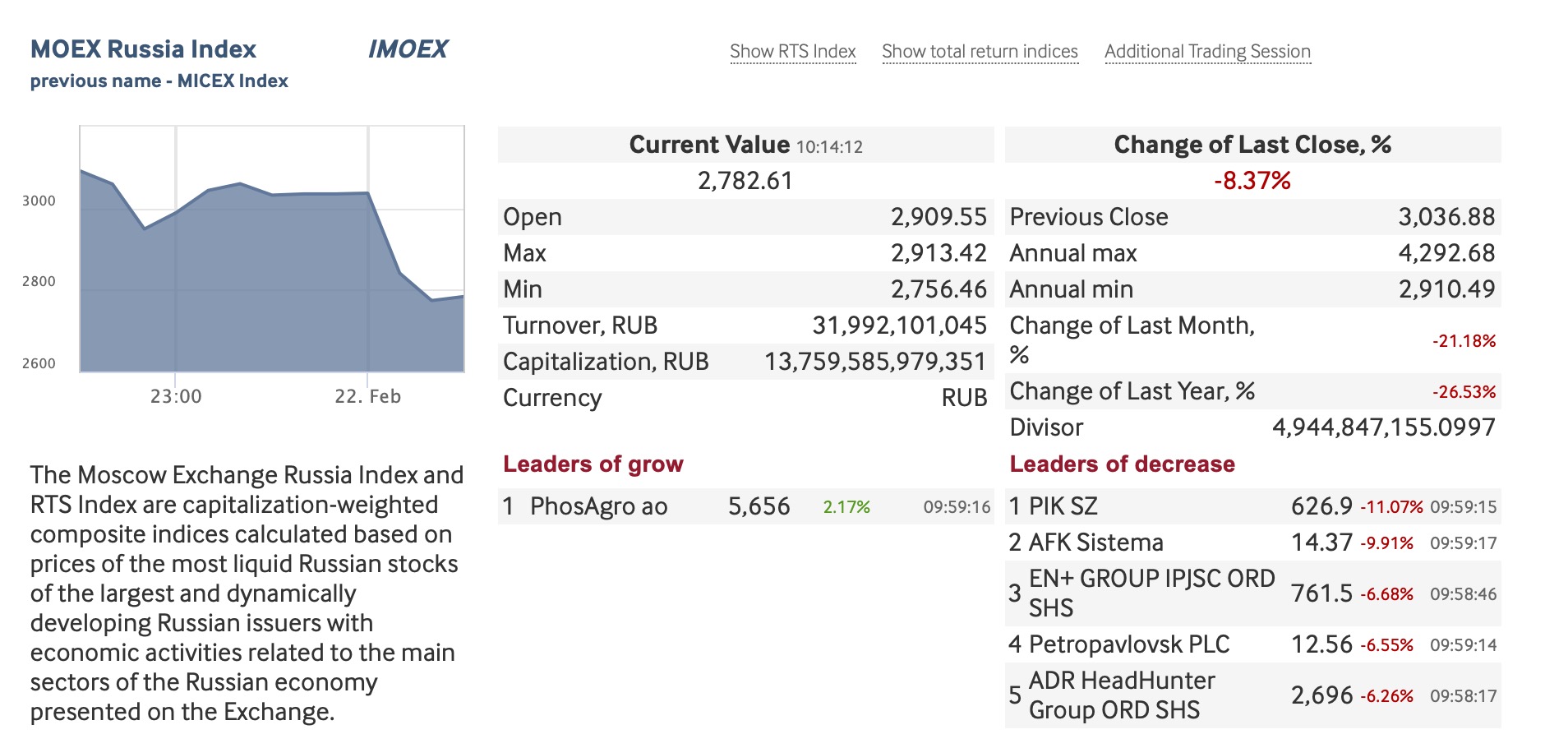 2月22日,俄罗斯MOEX指数跌幅一度扩大至逾8%,俄罗斯交易系统指数(RTS)跌幅超过10%。