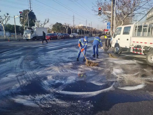 2月24日上午,宝山淞南环卫公司接到求助电话,长江西路钢四路路口因水管爆裂造成道路结冰,正值上班早高峰时期,存在较大行车安全隐患,需要紧急进行道路除冰。接电后,应急人员立即携带工业盐和道路清扫工具到达现场进行处置。