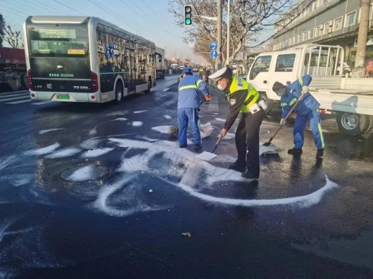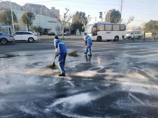 抵达现场后,应急人员立刻对结冰路面撒盐除冰和清扫,经过近30分钟的紧急处置,顺利将结冰路面处置干净,保障了该区域道路的安全通行。