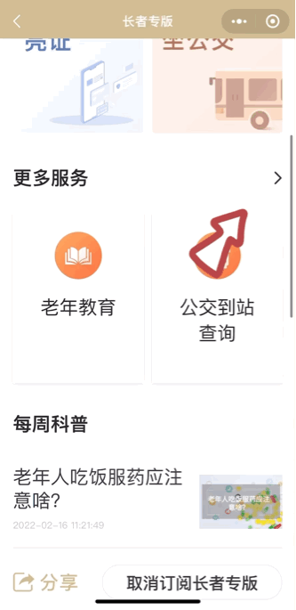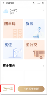 2、“长者专版”提供“随申码”、“就医”、“亮证”、“坐公交”四项常用服务,超大字体,色块呈现,方便老年群体浏览及使用,同时,支持一键分享给自己的“老伙伴们”。